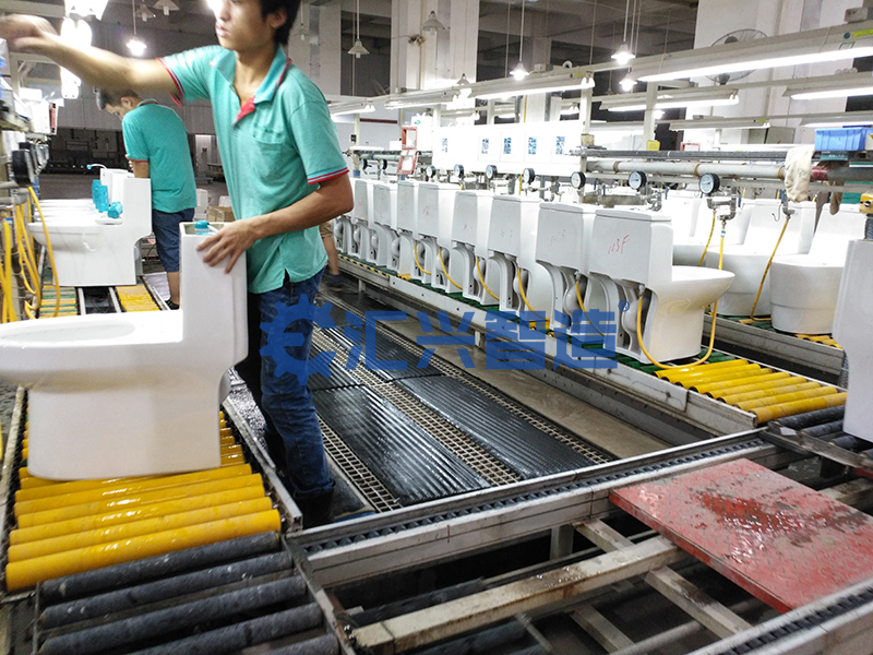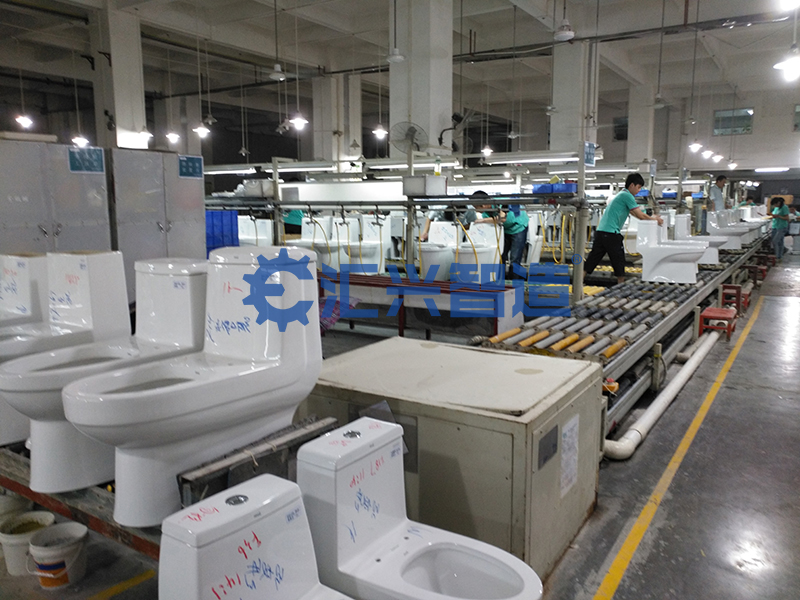 因?yàn)檫B體馬桶比較重,適合選擇做自動(dòng)組裝線輸送,必須要做單層工裝板或許上下層旋轉(zhuǎn)工裝板。其線體用高強(qiáng)度鋁型材制作,工裝板輸送鏈采用BS30-C212A三倍速鏈條,動(dòng)力采用變頻調(diào)速,阻擋器采用氣缸自動(dòng)阻擋。