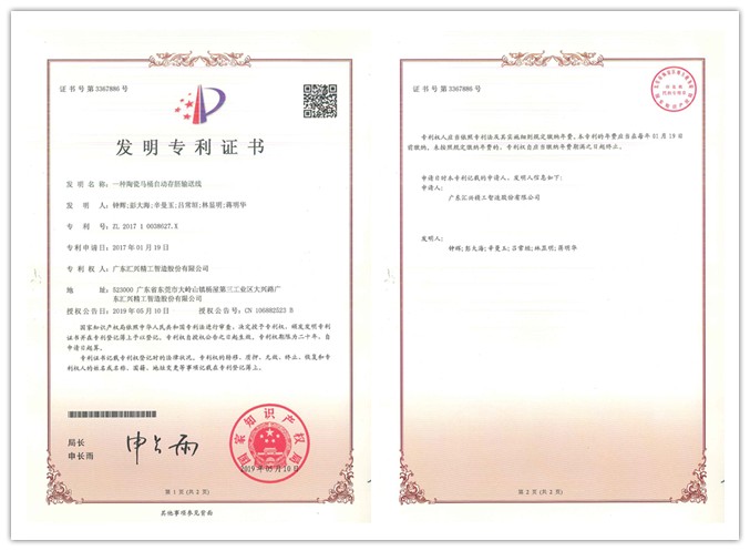 隨著科技進(jìn)步與技術(shù)創(chuàng)新不斷發(fā)展,自主知識產(chǎn)權(quán)儲備,尤其是創(chuàng)造性較高的發(fā)明專利已成為企業(yè)發(fā)展的核心競爭力。近日,廣東匯興精工智造股份有限公司(股票代碼:839258)又新增一項(xiàng)發(fā)明專利——《一種陶瓷馬桶自動(dòng)存胚輸送線》。