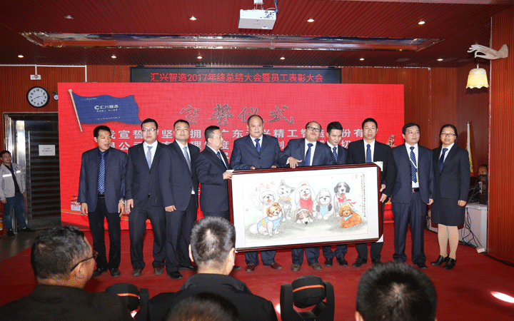晚會(huì)現(xiàn)場(chǎng),匯興智造董事會(huì)、監(jiān)事會(huì)成員登臺(tái)舉行宣誓儀式,為2018沖鋒表決心、擂戰(zhàn)鼓,確保公司在2020年前實(shí)現(xiàn)效率倍增、業(yè)績(jī)倍增、效益倍增,成功登陸創(chuàng)業(yè)板。儀式結(jié)束后,宣誓成員們圍繞在梁培浩教授贈(zèng)送的畫(huà)作《大吉大利》周圍,借用畫(huà)上8只憨態(tài)可掬的小狗送出“旺狗賀歲、歡樂(lè)祥瑞”的祝福。8,既代表2018,也代表“發(fā)”,祝福匯興智造在2018大發(fā)展,創(chuàng)新高。