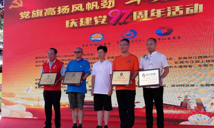 市工商聯(lián)(總商會(huì))副主席張軍民(中間)為活動(dòng)主辦單位授予榮譽(yù)牌匾,東莞市江西商會(huì)黨支部書記、匯興智造董事長(zhǎng)鐘輝(左二)代表商會(huì)上臺(tái)