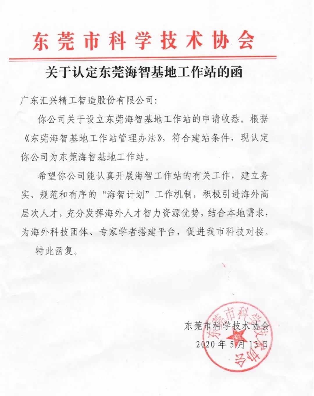 近日,東莞市科技協(xié)會公布了2020年度東莞海智基地工作站認(rèn)定函,廣東匯興精工智造股份有限公司(簡稱:匯興智造)成功獲批!
